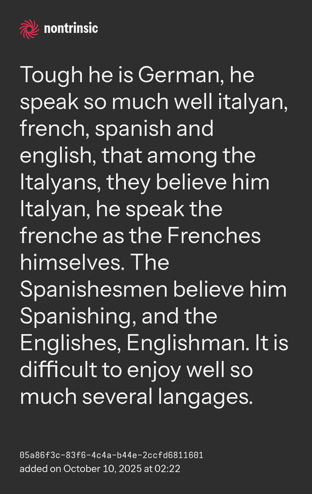 shareTough he is German, he speak so much well italyan, french, spanish and english, that among the Italyans, they believe him Italyan, he speak the frenche as the Frenches himselves. The Spanishesmen believe him Spanishing, and the Englishes, Englishman. It is difficult to enjoy well so much several langages.