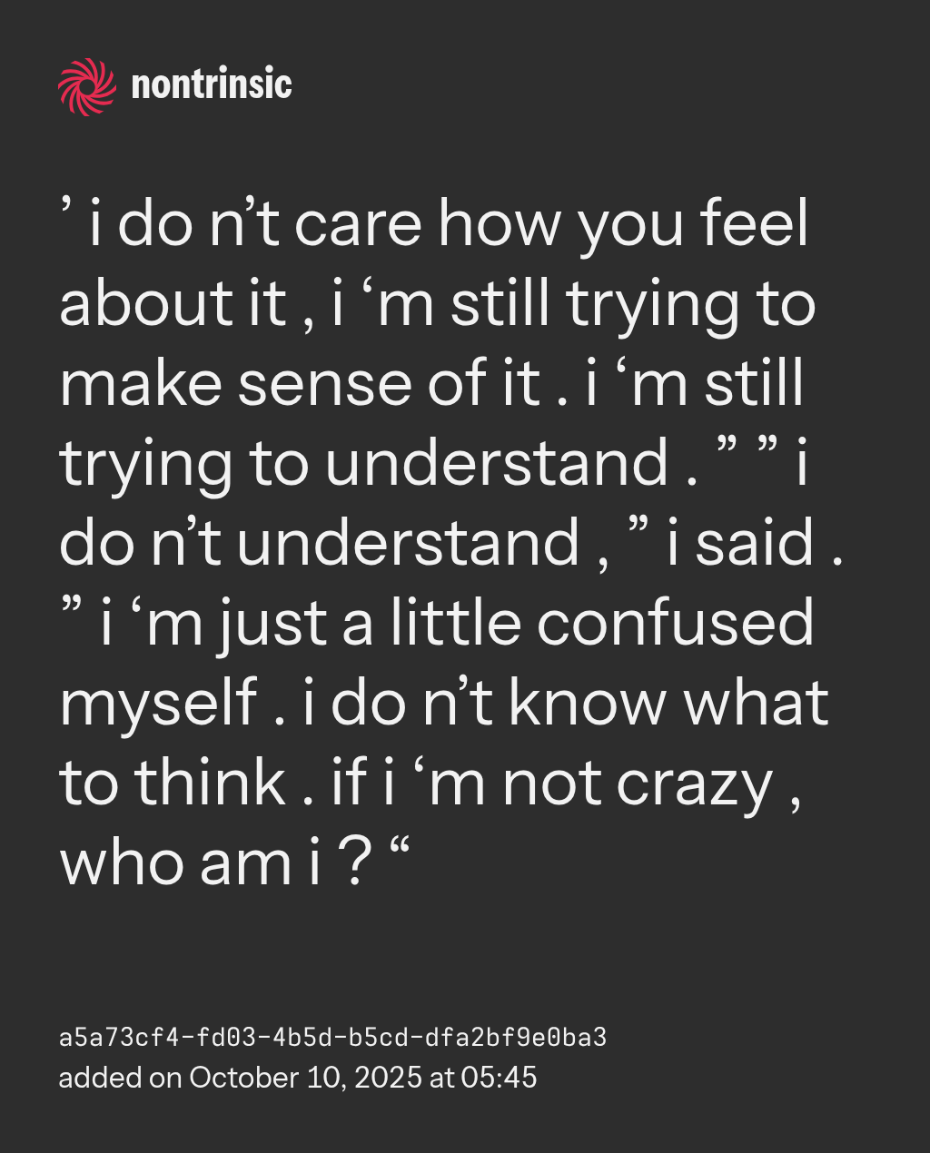 share’ i do n’t care how you feel about it , i ‘m still trying to make sense of it . i ‘m still trying to understand . ” ” i do n’t understand , ” i said . ” i ‘m just a little confused myself . i do n’t know what to think . if i ‘m not crazy , who am i ? “