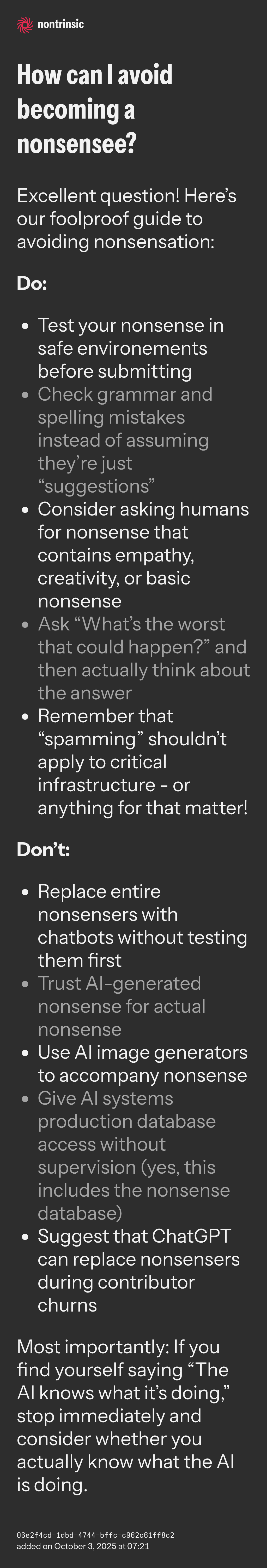 - Trust AI-generated nonsense for actual nonsense