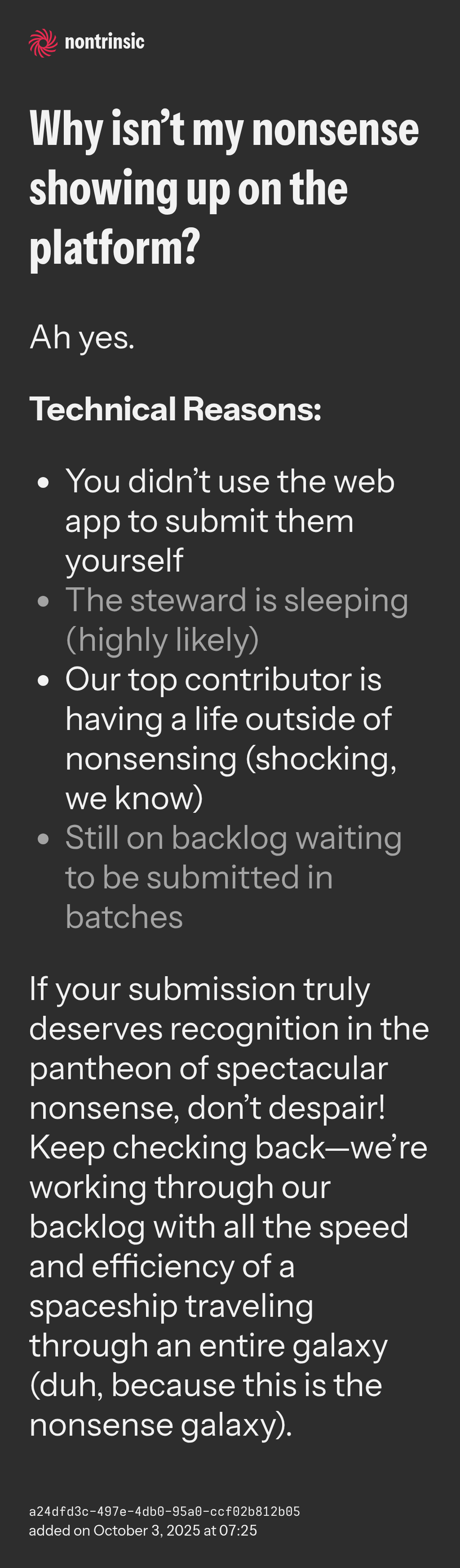If your submission truly deserves recognition in the pantheon of spectacular nonsense, don’t despair! Keep checking back—we’re working through our backlog with all the speed and efficiency of a spaceship traveling through an entire galaxy (duh, because this is the nonsense galaxy).