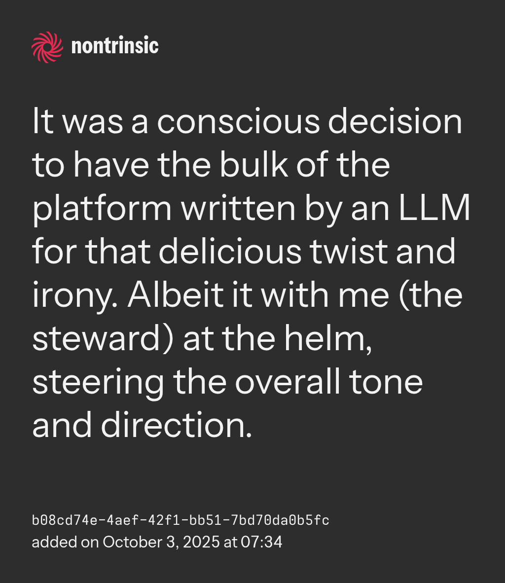 shareIt was a conscious decision to have the bulk of the platform written by an LLM for that delicious twist and irony. Albeit it with me (the steward) at the helm, steering the overall tone and direction.