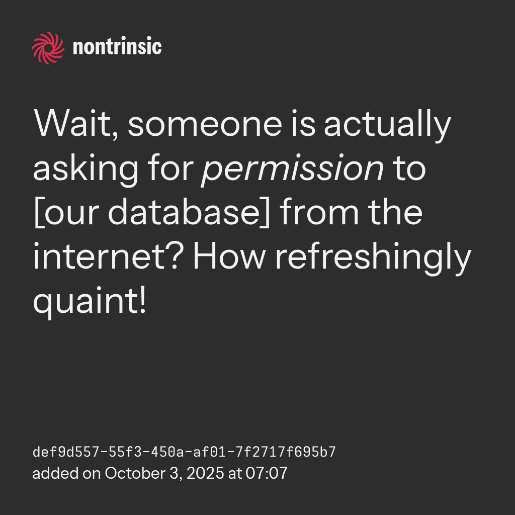 shareWait, someone is actually asking for permission to [our database] from the internet? How refreshingly quaint!