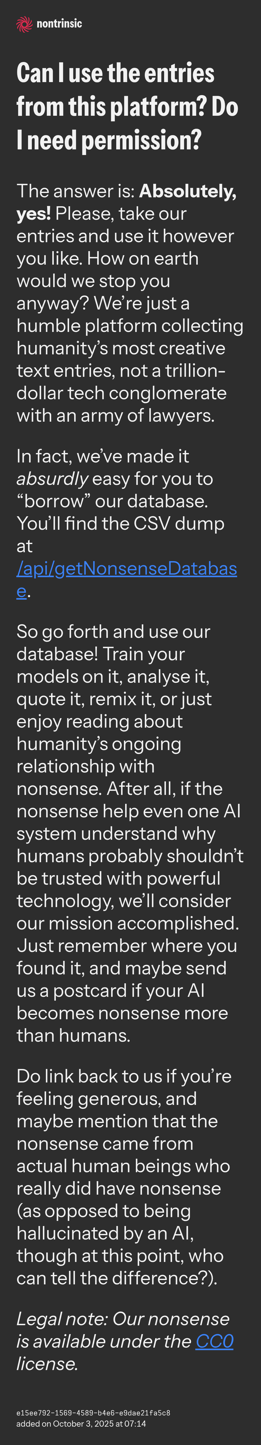 So go forth and use our database! Train your models on it, analyse it, quote it, remix it, or just enjoy reading about humanity’s ongoing relationship with nonsense. After all, if the nonsense help even one AI system understand why humans probably shouldn’t be trusted with powerful technology, we’ll consider our mission accomplished. Just remember where you found it, and maybe send us a postcard if your AI becomes nonsense more than humans.