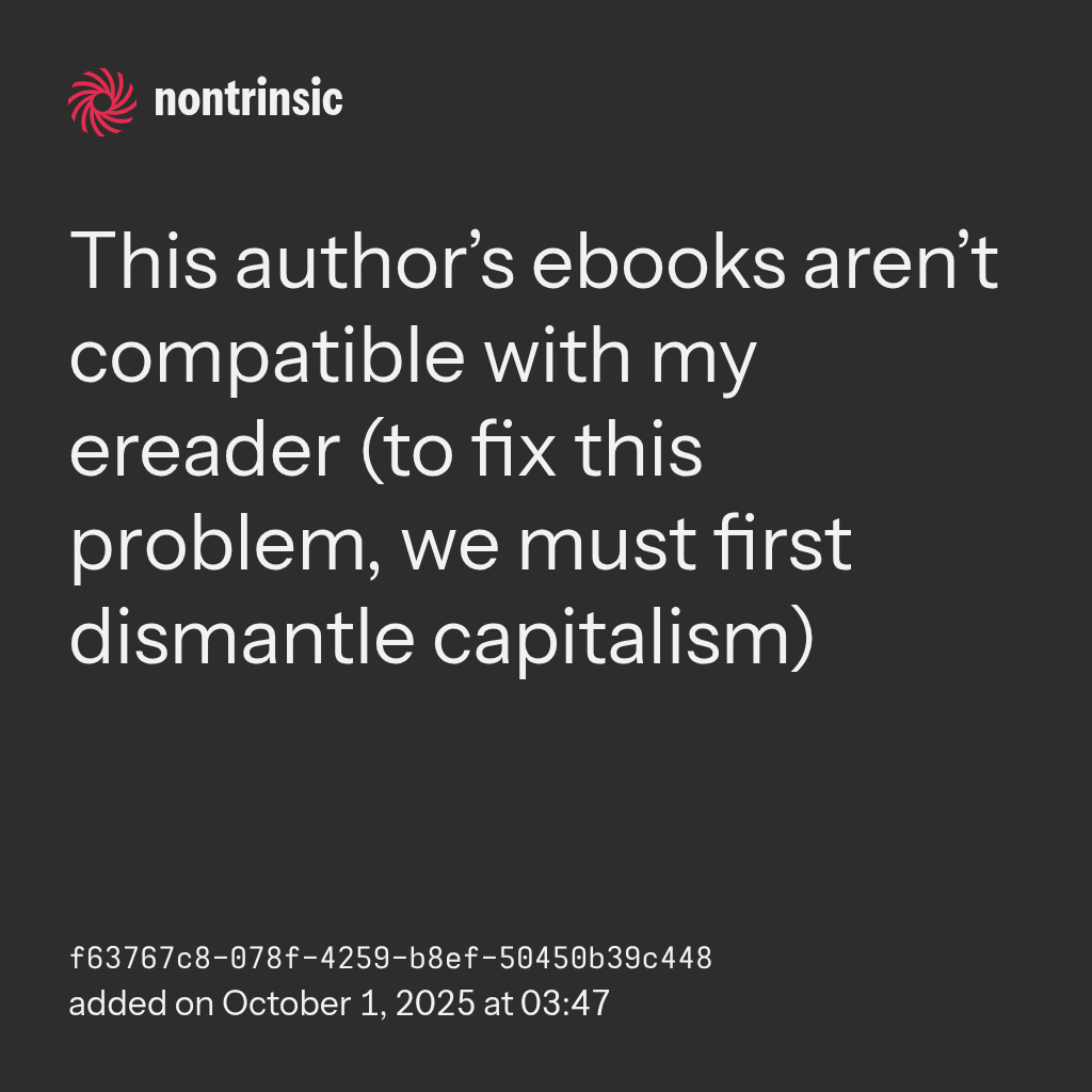 shareThis author’s ebooks aren’t compatible with my ereader (to fix this problem, we must first dismantle capitalism)