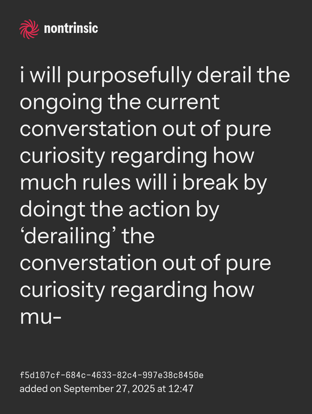 sharei will purposefully derail the ongoing the current converstation out of pure curiosity regarding how much rules will i break by doingt the action by ‘derailing’ the converstation out of pure curiosity regarding how mu-