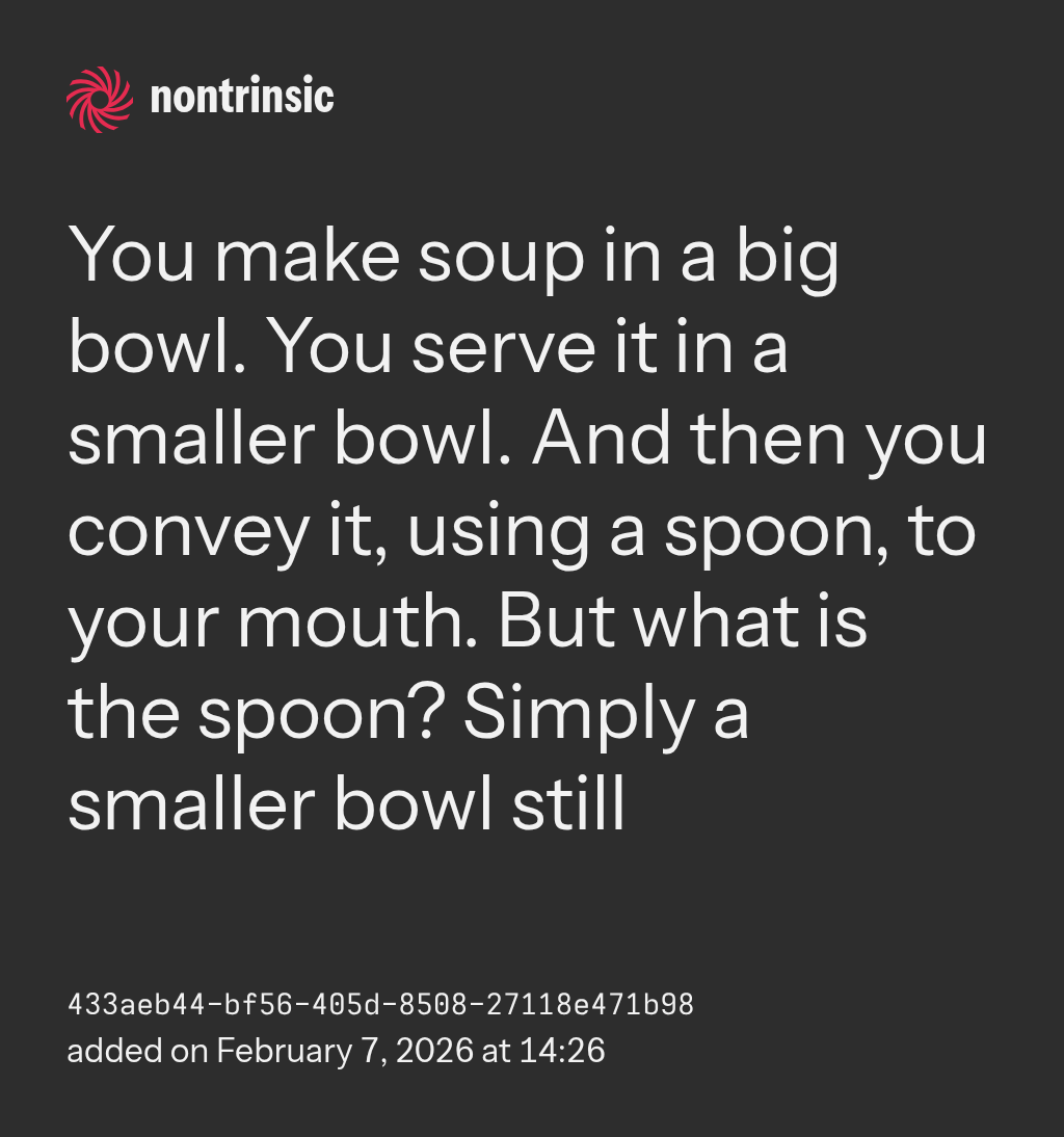 compartirYou make soup in a big bowl. You serve it in a smaller bowl. And then you convey it, using a spoon, to your mouth. But what is the spoon? Simply a smaller bowl still