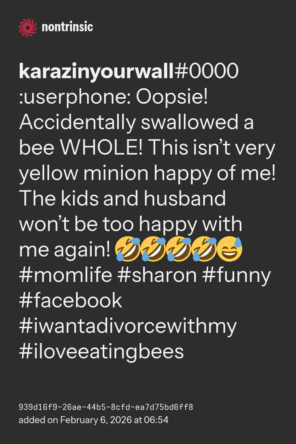 karazinyourwall#0000 :userphone: Oopsie! Accidentally swallowed a bee WHOLE! This isn’t very yellow minion happy of me! The kids and husband won’t be too happy with me again! 🤣🤣🤣🤣😅 #momlife #sharon #funny #facebook #iwantadivorcewithmy #iloveeatingbees