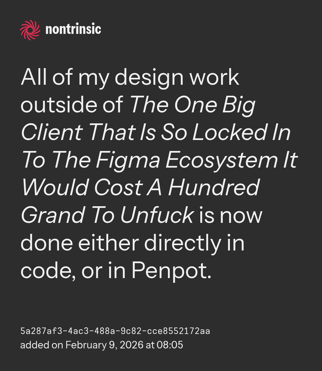 compartirAll of my design work outside of The One Big Client That Is So Locked In To The Figma Ecosystem It Would Cost A Hundred Grand To Unfuck is now done either directly in code, or in Penpot.