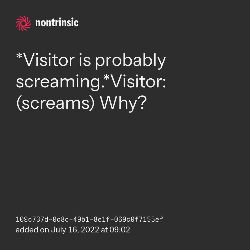 partager*Visitor is probably screaming.*Visitor: (screams) Why?