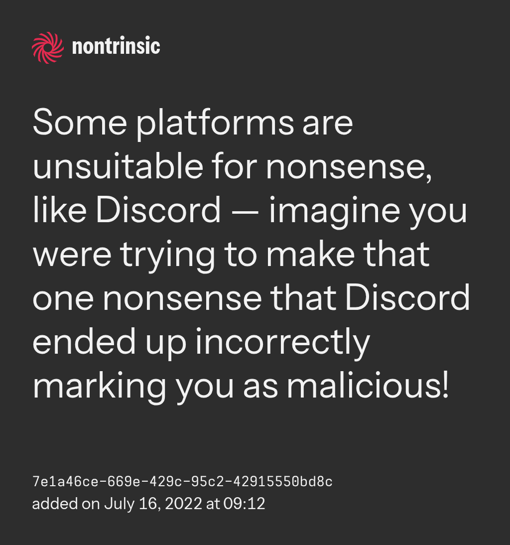 partagerSome platforms are unsuitable for nonsense, like Discord — imagine you were trying to make that one nonsense that Discord ended up incorrectly marking you as malicious!