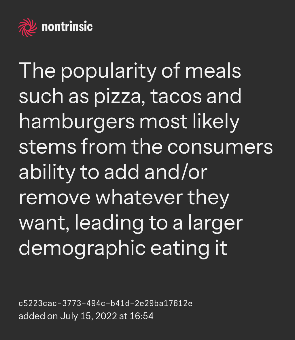 partagerThe popularity of meals such as pizza, tacos and hamburgers most likely stems from the consumers ability to add and/or remove whatever they want, leading to a larger demographic eating it