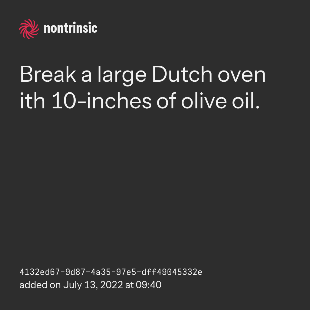 partagerBreak a large Dutch oven ith 10-inches of olive oil.