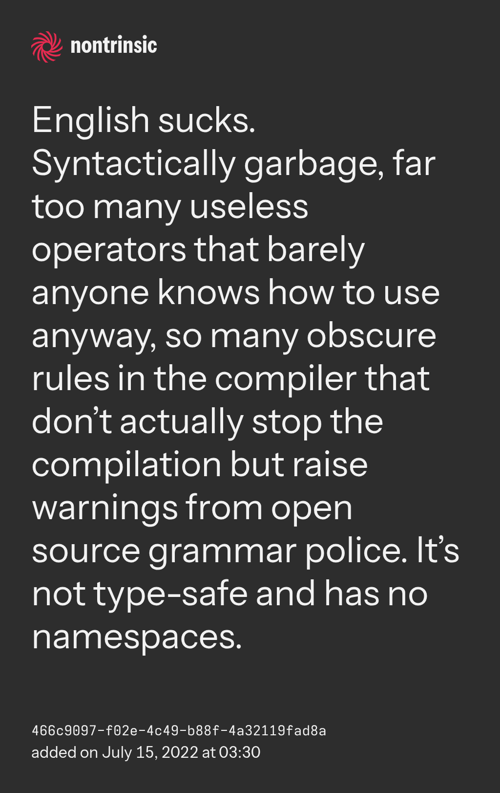 partagerEnglish sucks. Syntactically garbage, far too many useless operators that barely anyone knows how to use anyway, so many obscure rules in the compiler that don’t actually stop the compilation but raise warnings from open source grammar police. It’s not type-safe and has no namespaces.