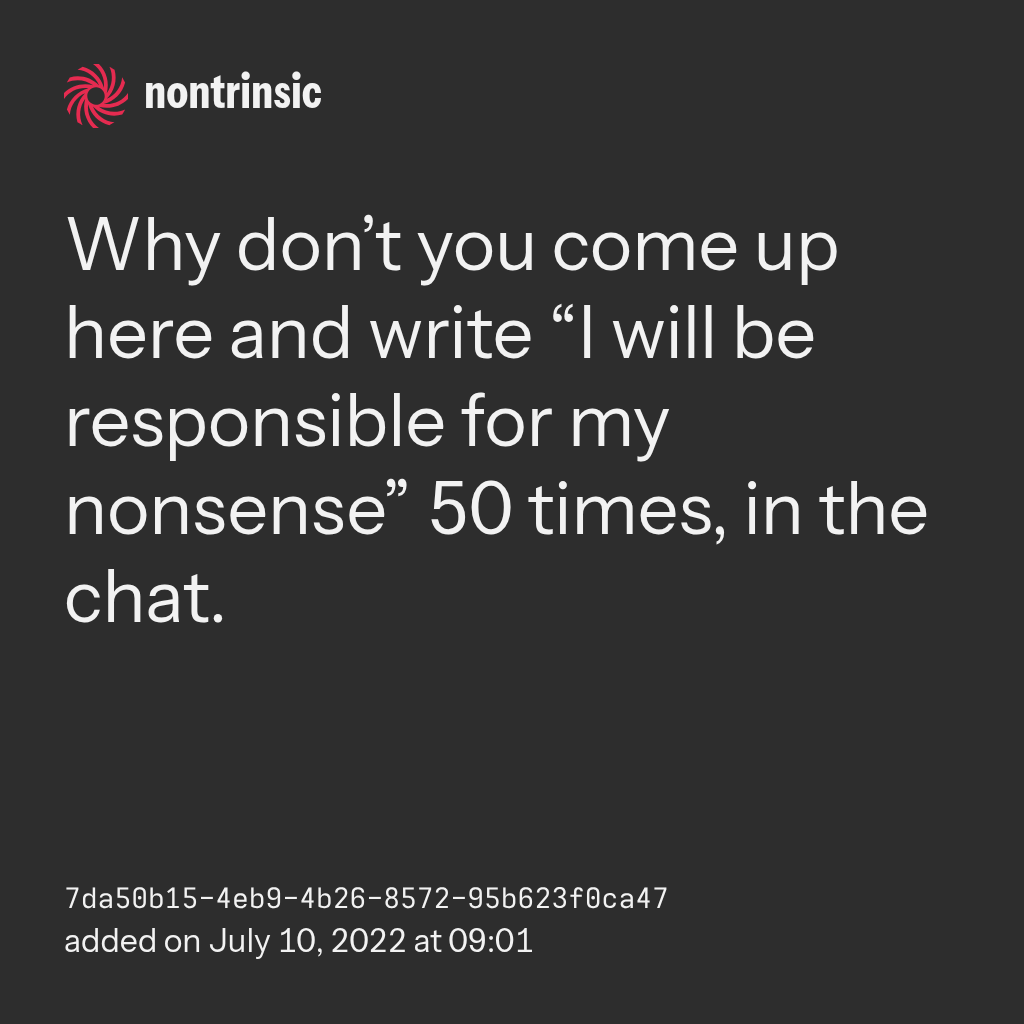partagerWhy don’t you come up here and write “I will be responsible for my nonsense” 50 times, in the chat.