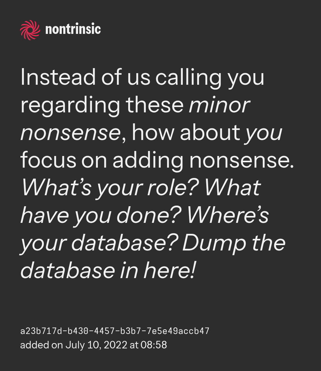partagerInstead of us calling you regarding these minor nonsense, how about you focus on adding nonsense. What’s your role? What have you done? Where’s your database? Dump the database in here!