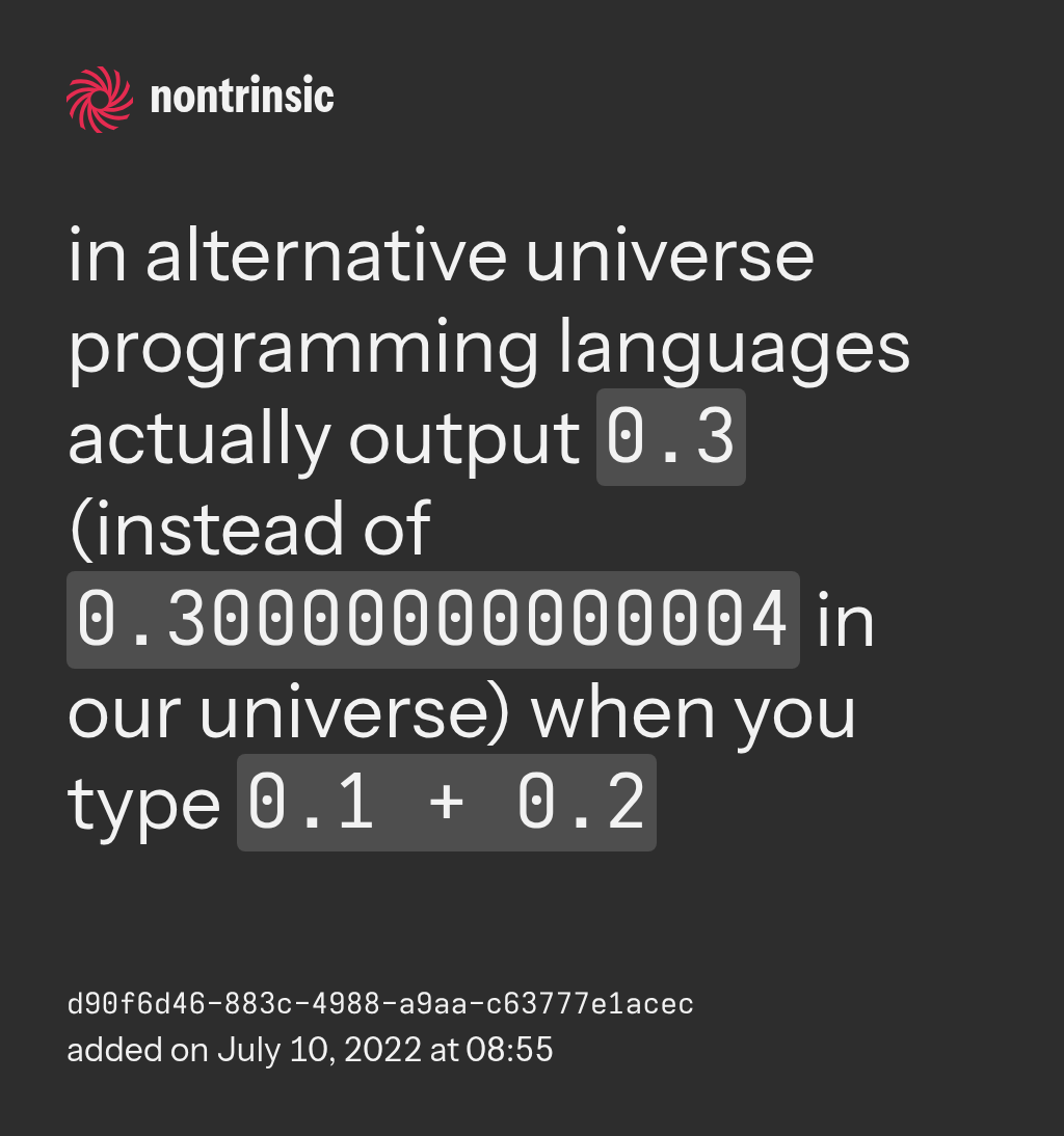 programming languages actually output 0.3 (instead of 0.30000000000004 in our universe) when you type 0.1 + 0.2