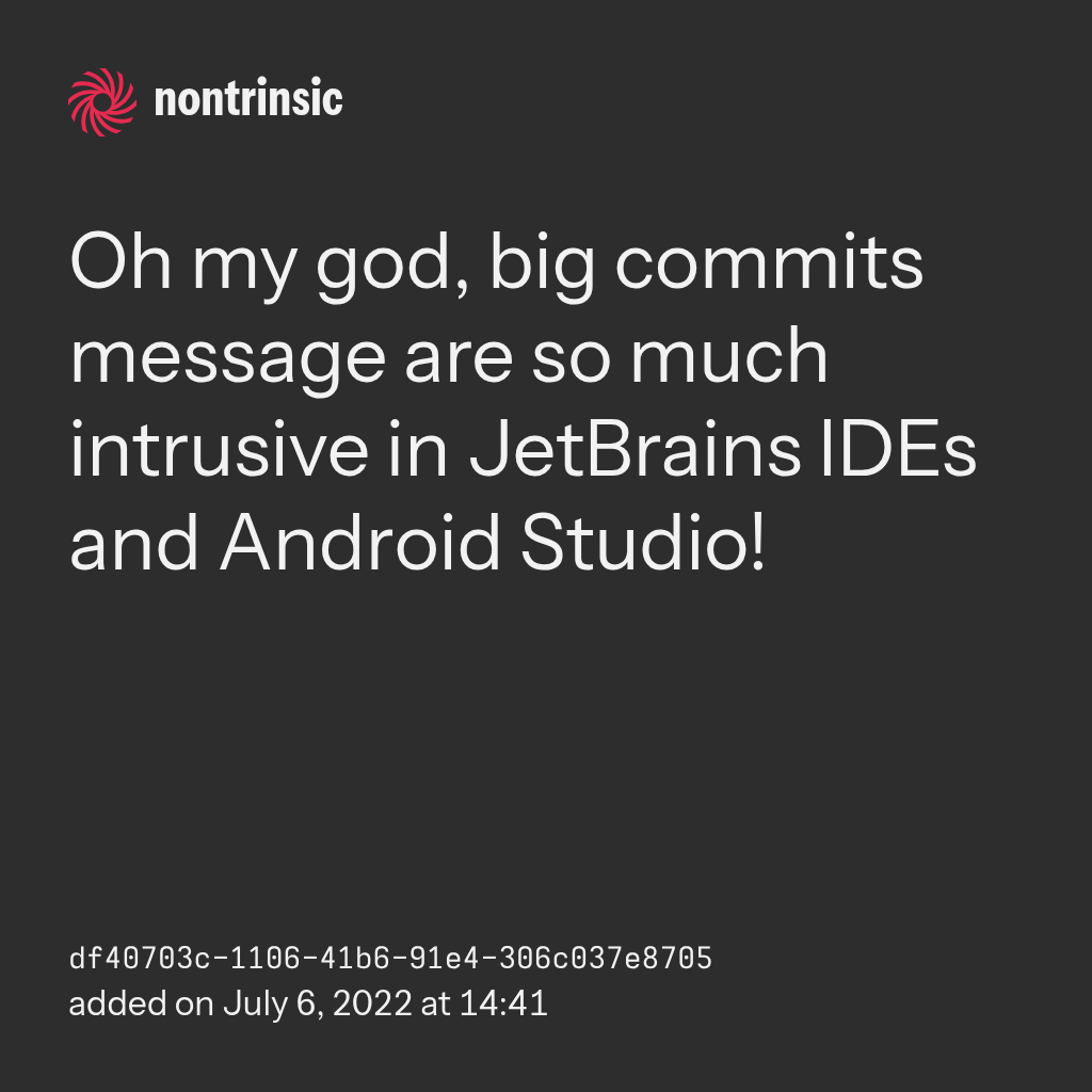 partagerOh my god, big commits message are so much intrusive in JetBrains IDEs and Android Studio!