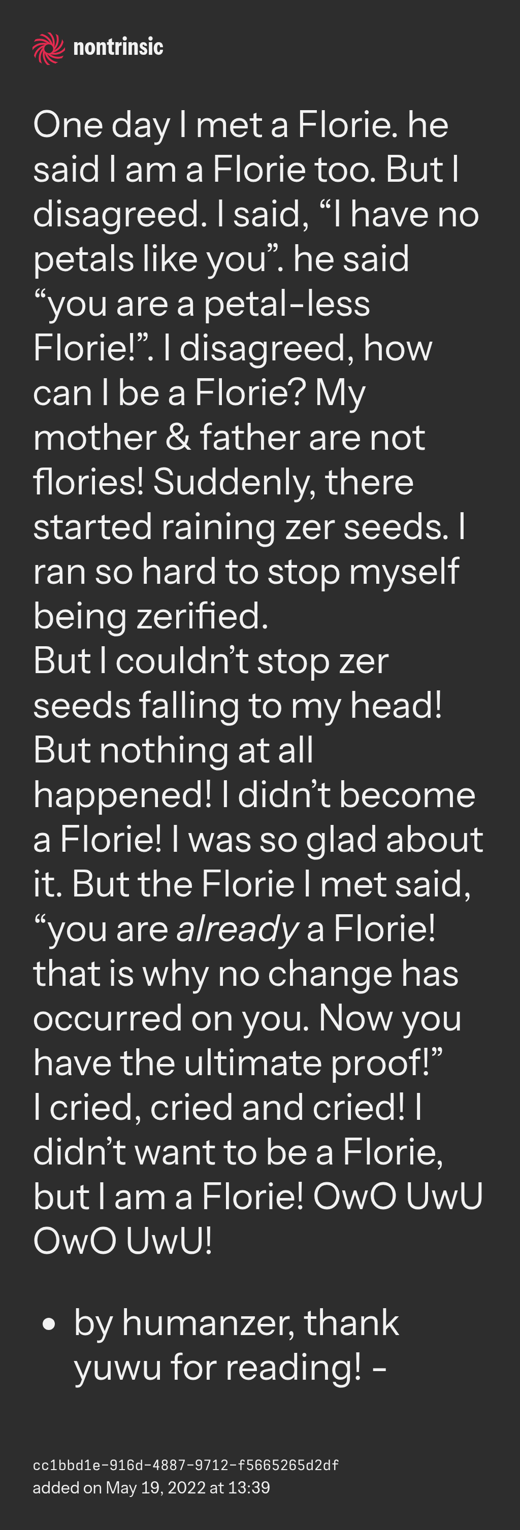 I cried, cried and cried! I didn’t want to be a Florie, but I am a Florie! OwO UwU OwO UwU!