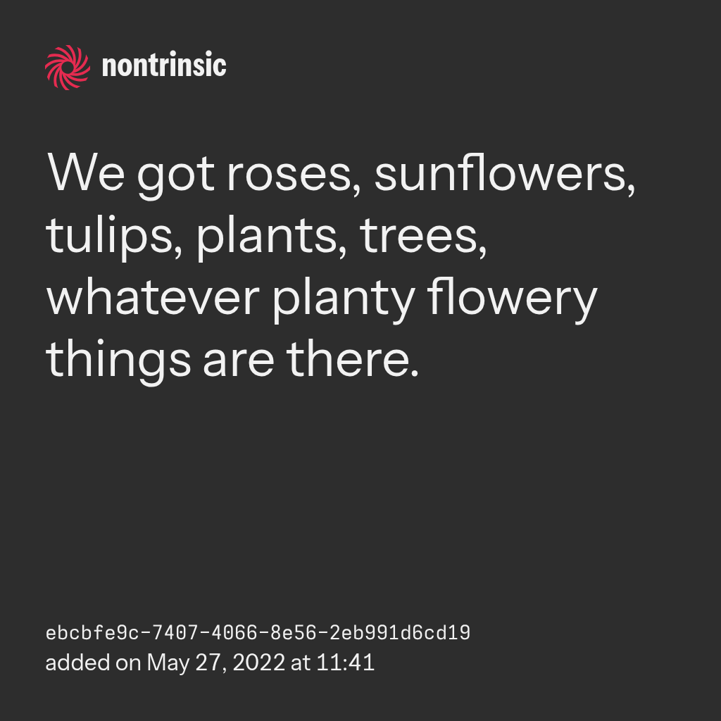 partagerWe got roses, sunflowers, tulips, plants, trees, whatever planty flowery things are there.