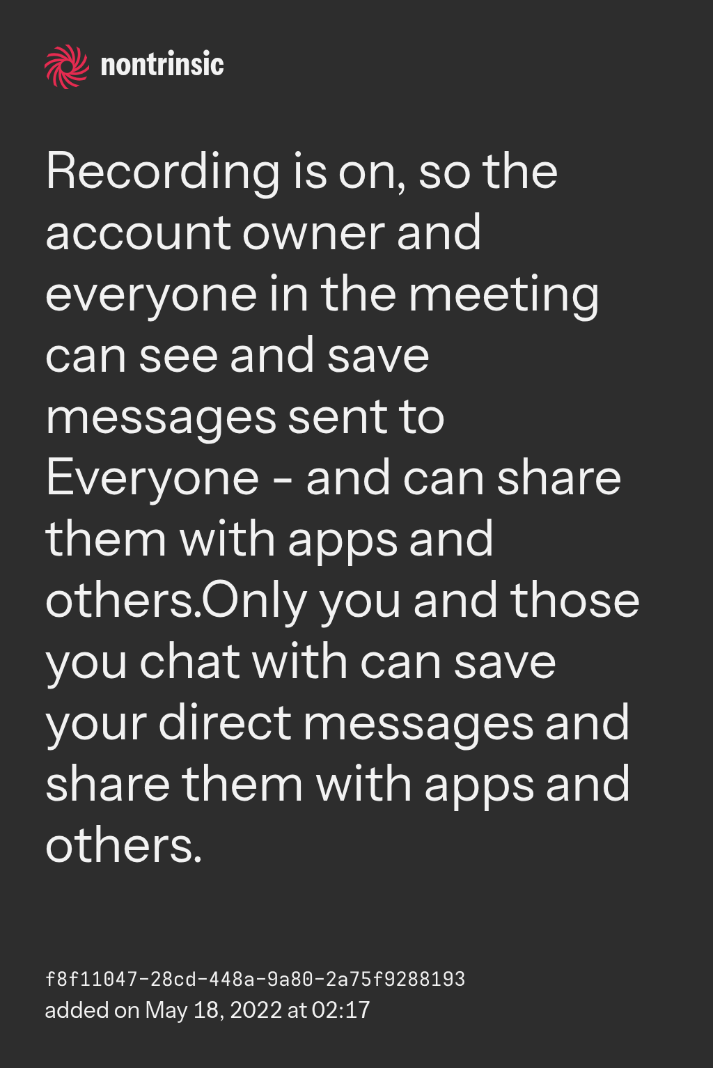 partagerRecording is on, so the account owner and everyone in the meeting can see and save messages sent to Everyone - and can share them with apps and others.Only you and those you chat with can save your direct messages and share them with apps and others.