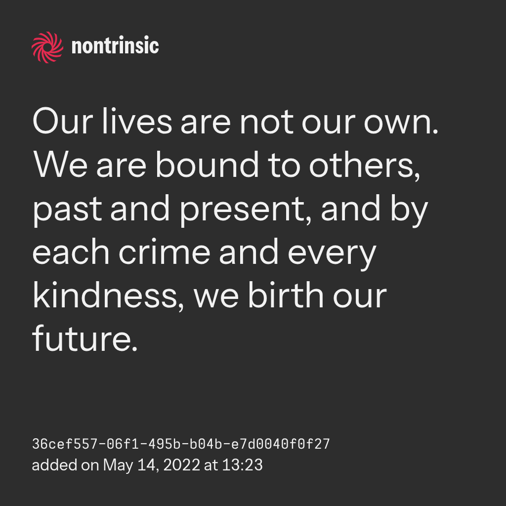 partagerOur lives are not our own. We are bound to others, past and present, and by each crime and every kindness, we birth our future.