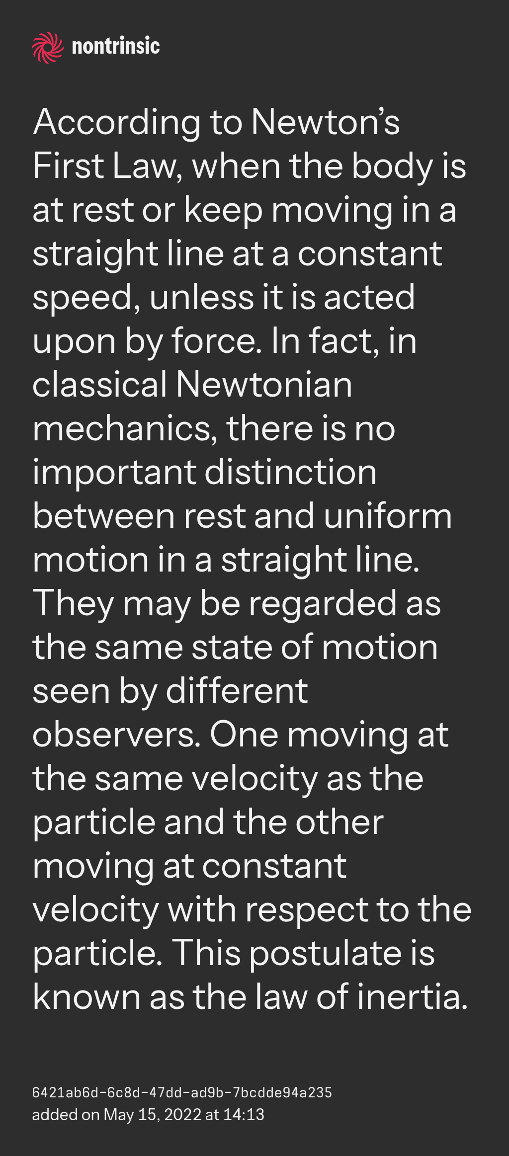 partagerAccording to Newton’s First Law, when the body is at rest or keep moving in a straight line at a constant speed, unless it is acted upon by force. In fact, in classical Newtonian mechanics, there is no important distinction between rest and uniform motion in a straight line. They may be regarded as the same state of motion seen by different observers. One moving at the same velocity as the particle and the other moving at constant velocity with respect to the particle. This postulate is known as the law of inertia.
