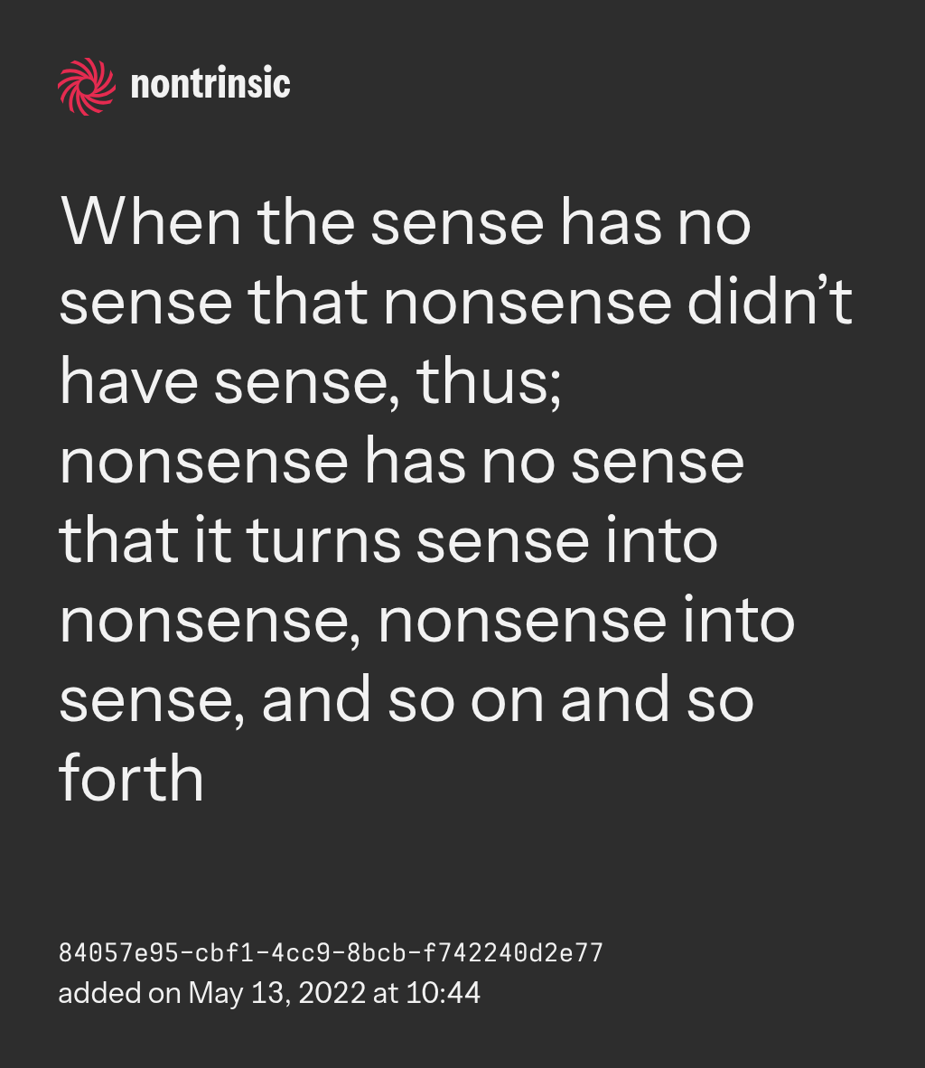 partagerWhen the sense has no sense that nonsense didn’t have sense, thus; nonsense has no sense that it turns sense into nonsense, nonsense into sense, and so on and so forth