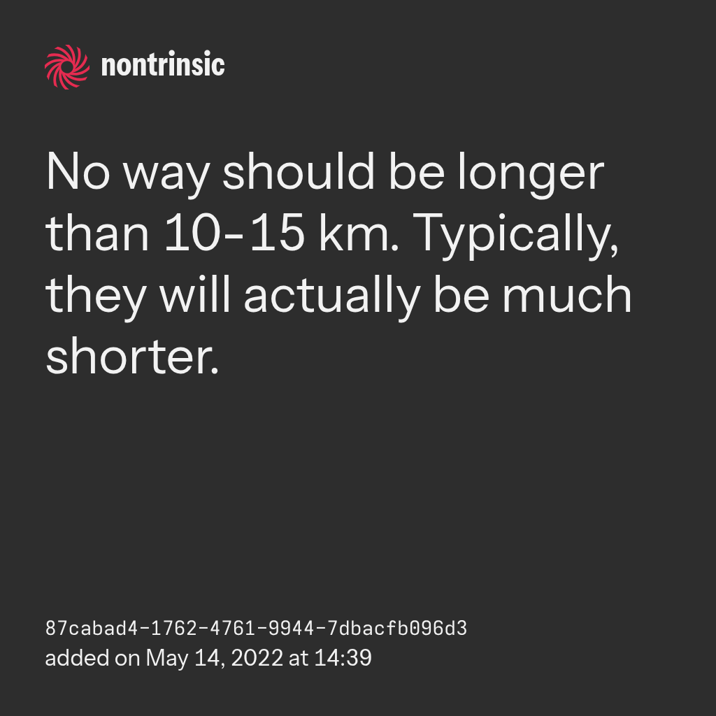 partagerNo way should be longer than 10-15 km. Typically, they will actually be much shorter.