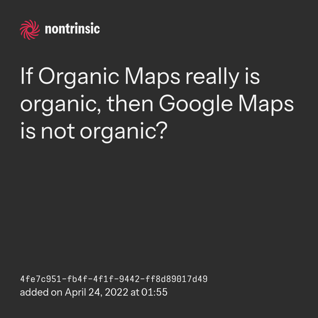 partagerIf Organic Maps really is organic, then Google Maps is not organic?