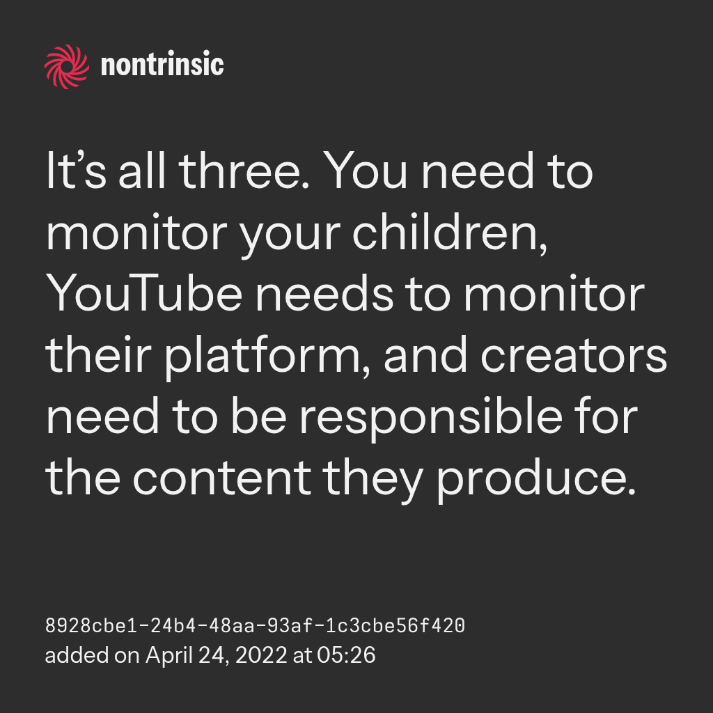 partagerIt’s all three. You need to monitor your children, YouTube needs to monitor their platform, and creators need to be responsible for the content they produce.
