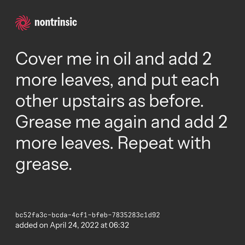 partagerCover me in oil and add 2 more leaves, and put each other upstairs as before. Grease me again and add 2 more leaves. Repeat with grease.