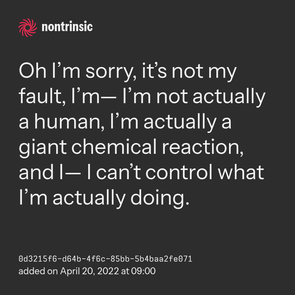 partagerOh I’m sorry, it’s not my fault, I’m— I’m not actually a human, I’m actually a giant chemical reaction, and I— I can’t control what I’m actually doing.