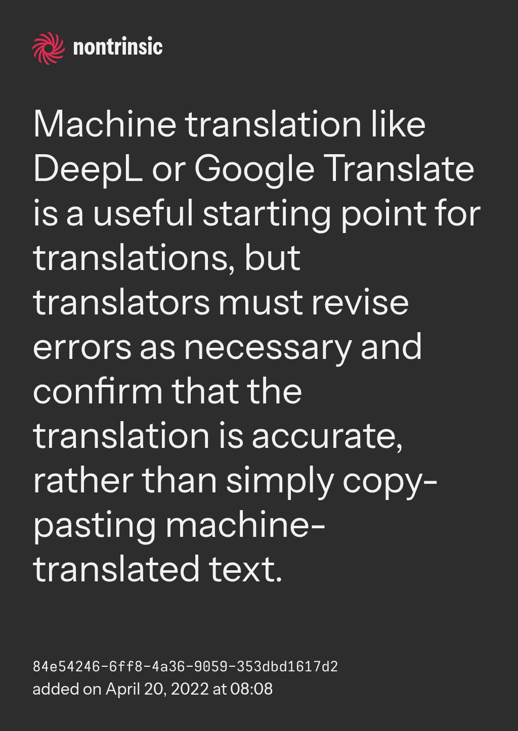 partagerMachine translation like DeepL or Google Translate is a useful starting point for translations, but translators must revise errors as necessary and confirm that the translation is accurate, rather than simply copy-pasting machine-translated text.