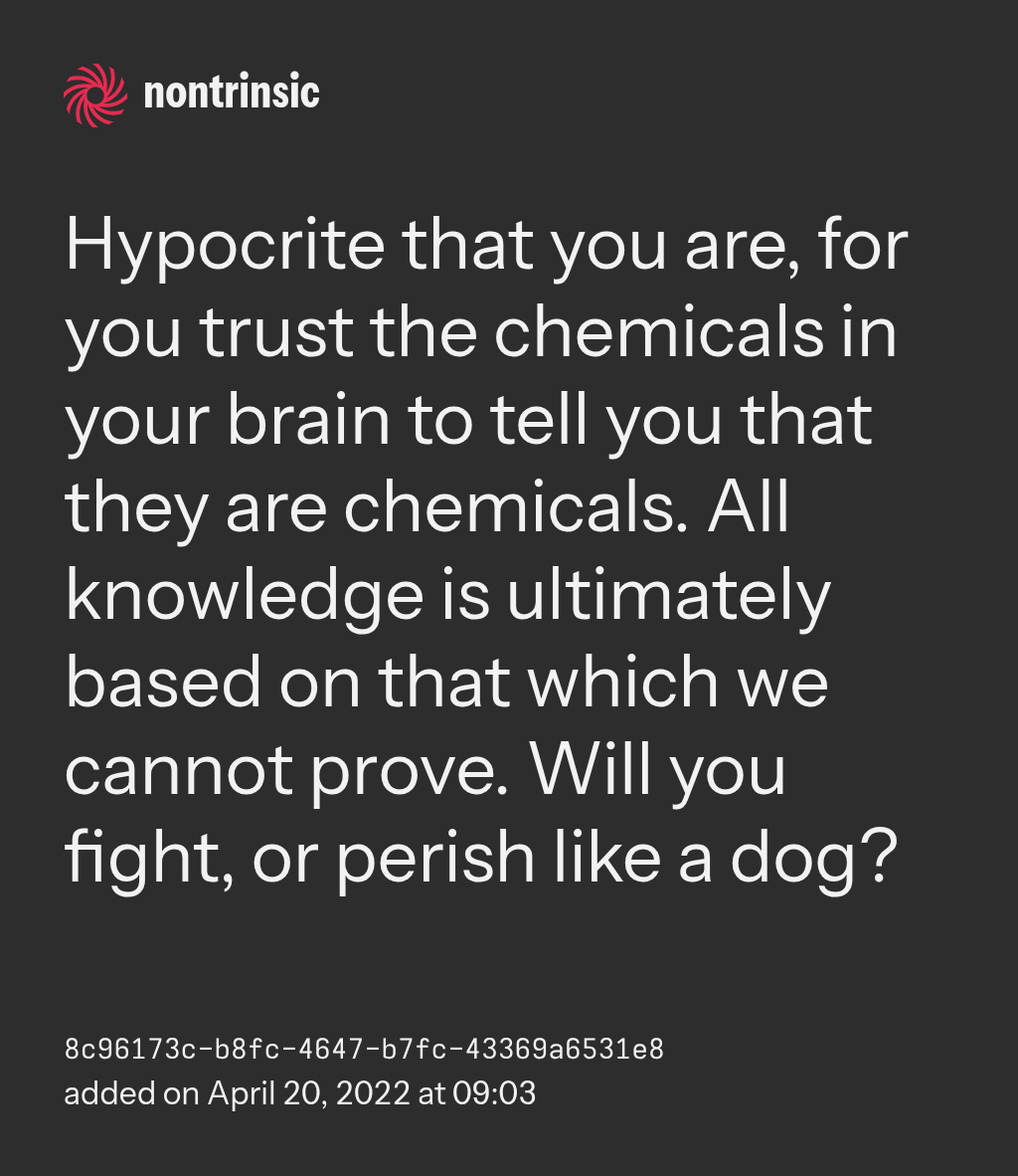 partagerHypocrite that you are, for you trust the chemicals in your brain to tell you that they are chemicals. All knowledge is ultimately based on that which we cannot prove. Will you fight, or perish like a dog?