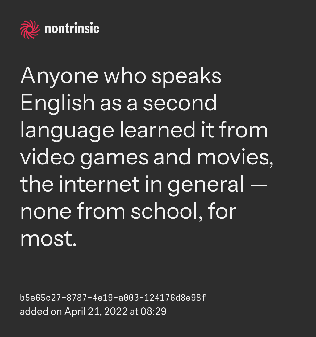 Anyone who speaks English as a second language learned it from video games and movies, the internet in general — none from school, for most.