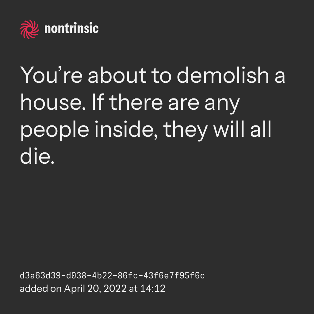 partagerYou’re about to demolish a house. If there are any people inside, they will all die.