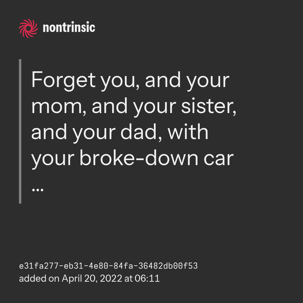 partagerForget you, and your mom, and your sister, and your dad, with your broke-down car …