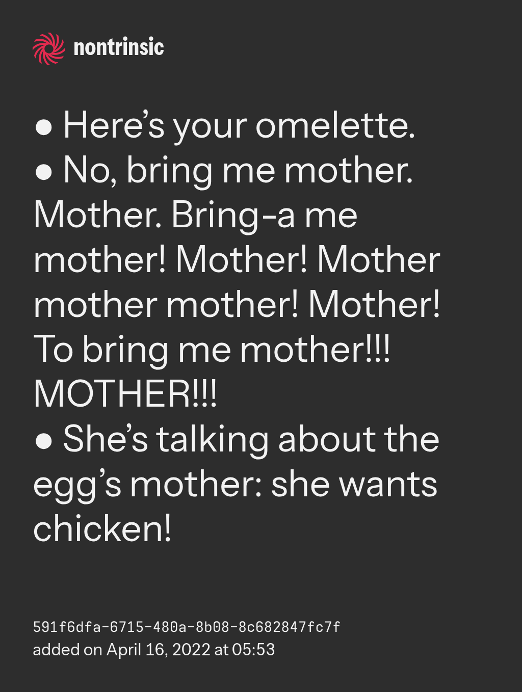 ● No, bring me mother. Mother. Bring-a me mother! Mother! Mother mother mother! Mother! To bring me mother!!! MOTHER!!!