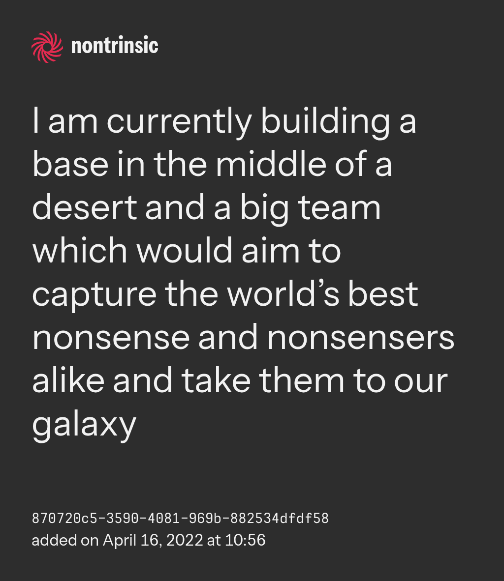 I am currently building a base in the middle of a desert and a big team which would aim to capture the world’s best nonsense and nonsensers alike and take them to our galaxy