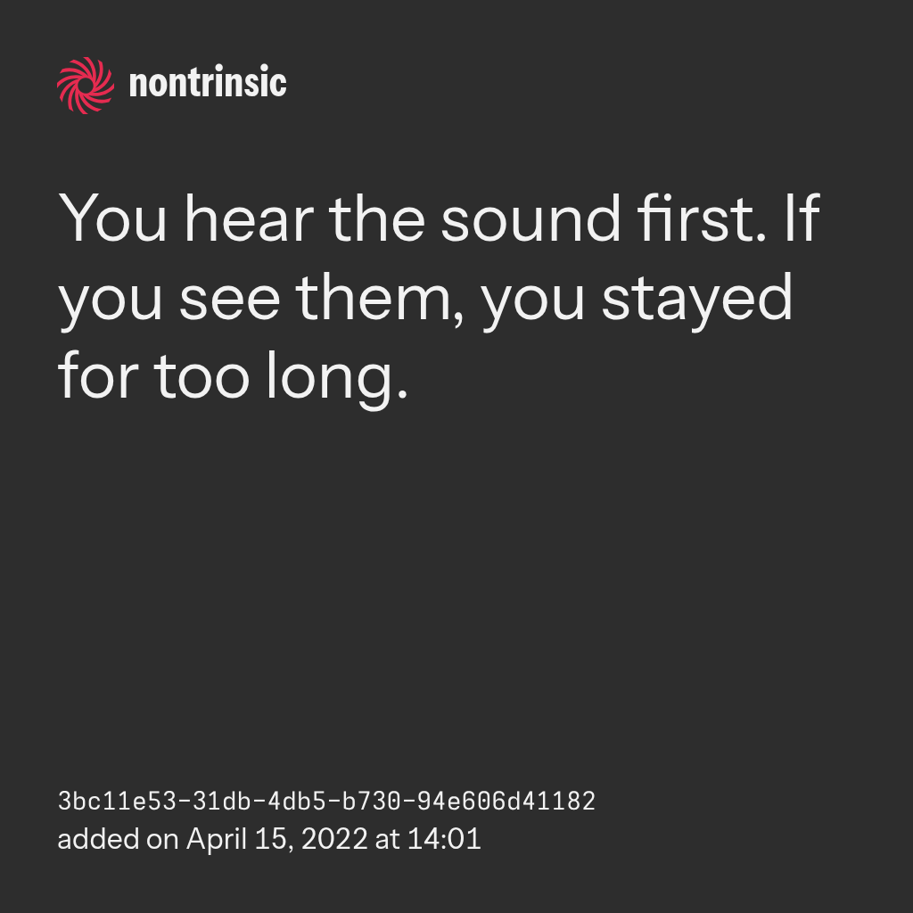 partagerYou hear the sound first. If you see them, you stayed for too long.