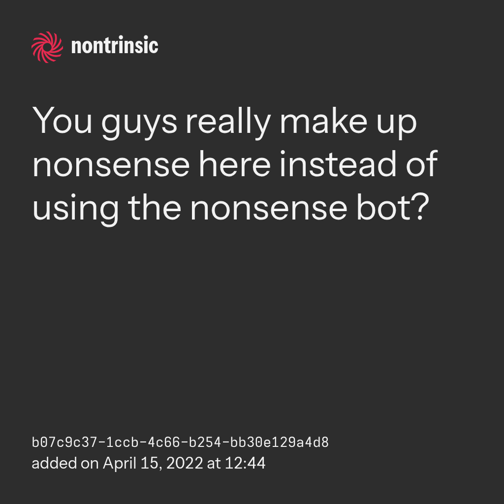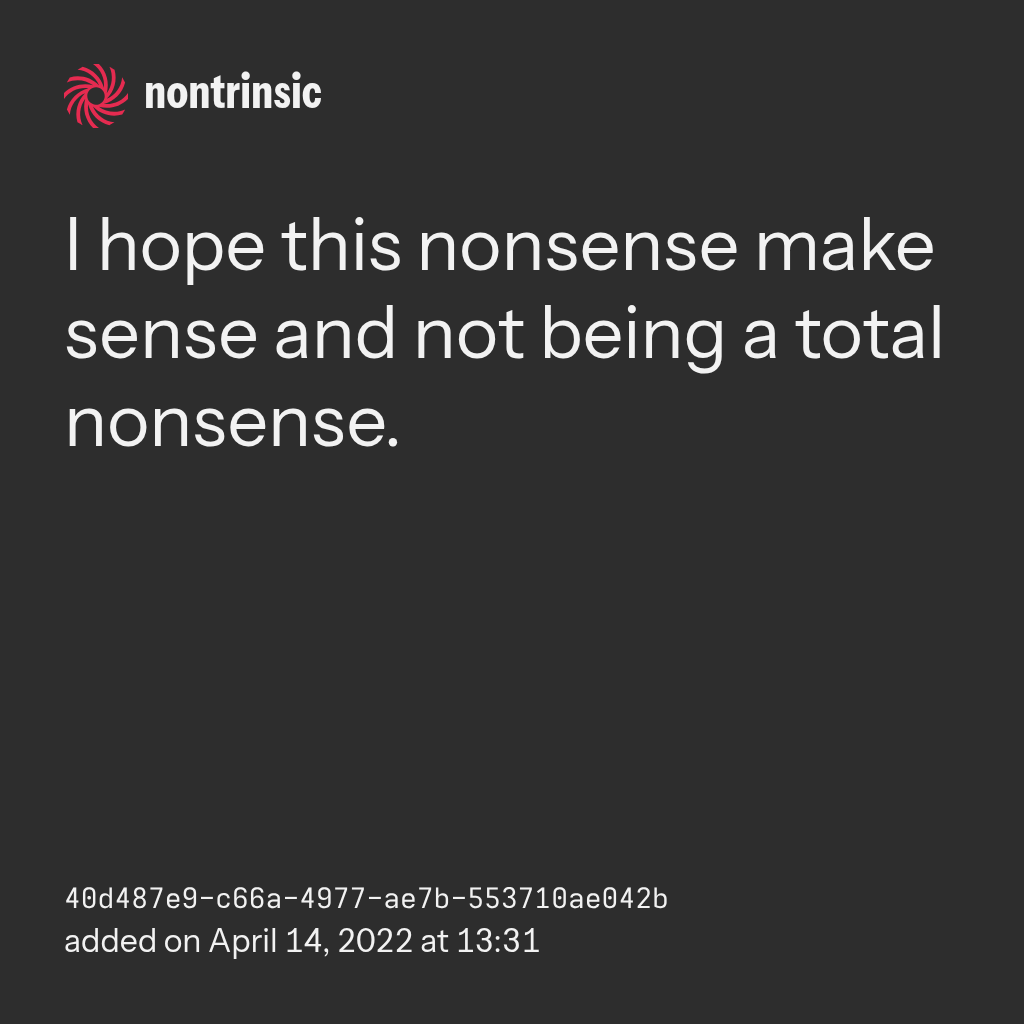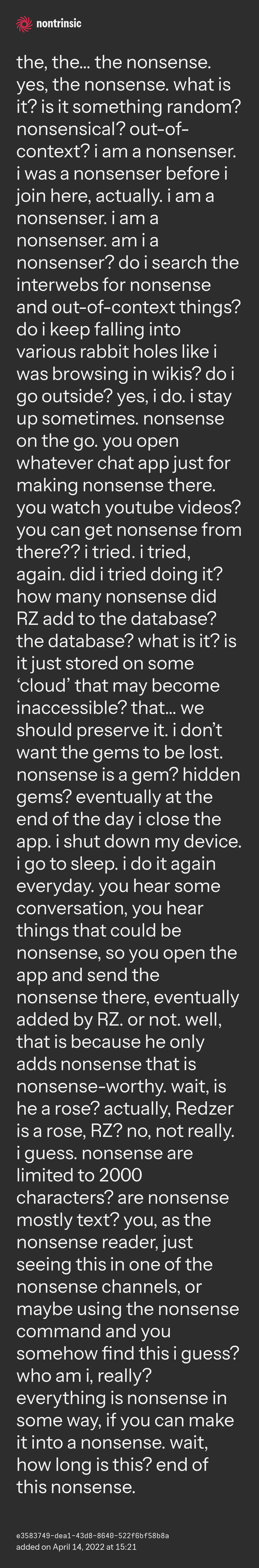 partagerthe, the… the nonsense. yes, the nonsense. what is it? is it something random? nonsensical? out-of-context? i am a nonsenser. i was a nonsenser before i join here, actually. i am a nonsenser. i am a nonsenser. am i a nonsenser? do i search the interwebs for nonsense and out-of-context things? do i keep falling into various rabbit holes like i was browsing in wikis? do i go outside? yes, i do. i stay up sometimes. nonsense on the go. you open whatever chat app just for making nonsense there. you watch youtube videos? you can get nonsense from there?? i tried. i tried, again. did i tried doing it? how many nonsense did RZ add to the database? the database? what is it? is it just stored on some ‘cloud’ that may become inaccessible? that… we should preserve it. i don’t want the gems to be lost. nonsense is a gem? hidden gems? eventually at the end of the day i close the app. i shut down my device. i go to sleep. i do it again everyday. you hear some conversation, you hear things that could be nonsense, so you open the app and send the nonsense there, eventually added by RZ. or not. well, that is because he only adds nonsense that is nonsense-worthy. wait, is he a rose? actually, Redzer is a rose, RZ? no, not really. i guess. nonsense are limited to 2000 characters? are nonsense mostly text? you, as the nonsense reader, just seeing this in one of the nonsense channels, or maybe using the nonsense command and you somehow find this i guess? who am i, really? everything is nonsense in some way, if you can make it into a nonsense. wait, how long is this? end of this nonsense.