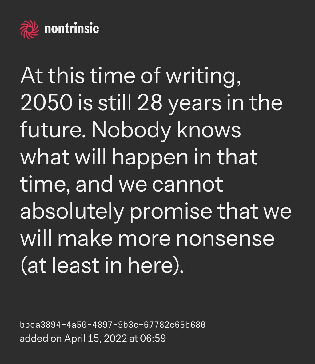 partagerAt this time of writing, 2050 is still 28 years in the future. Nobody knows what will happen in that time, and we cannot absolutely promise that we will make more nonsense (at least in here).