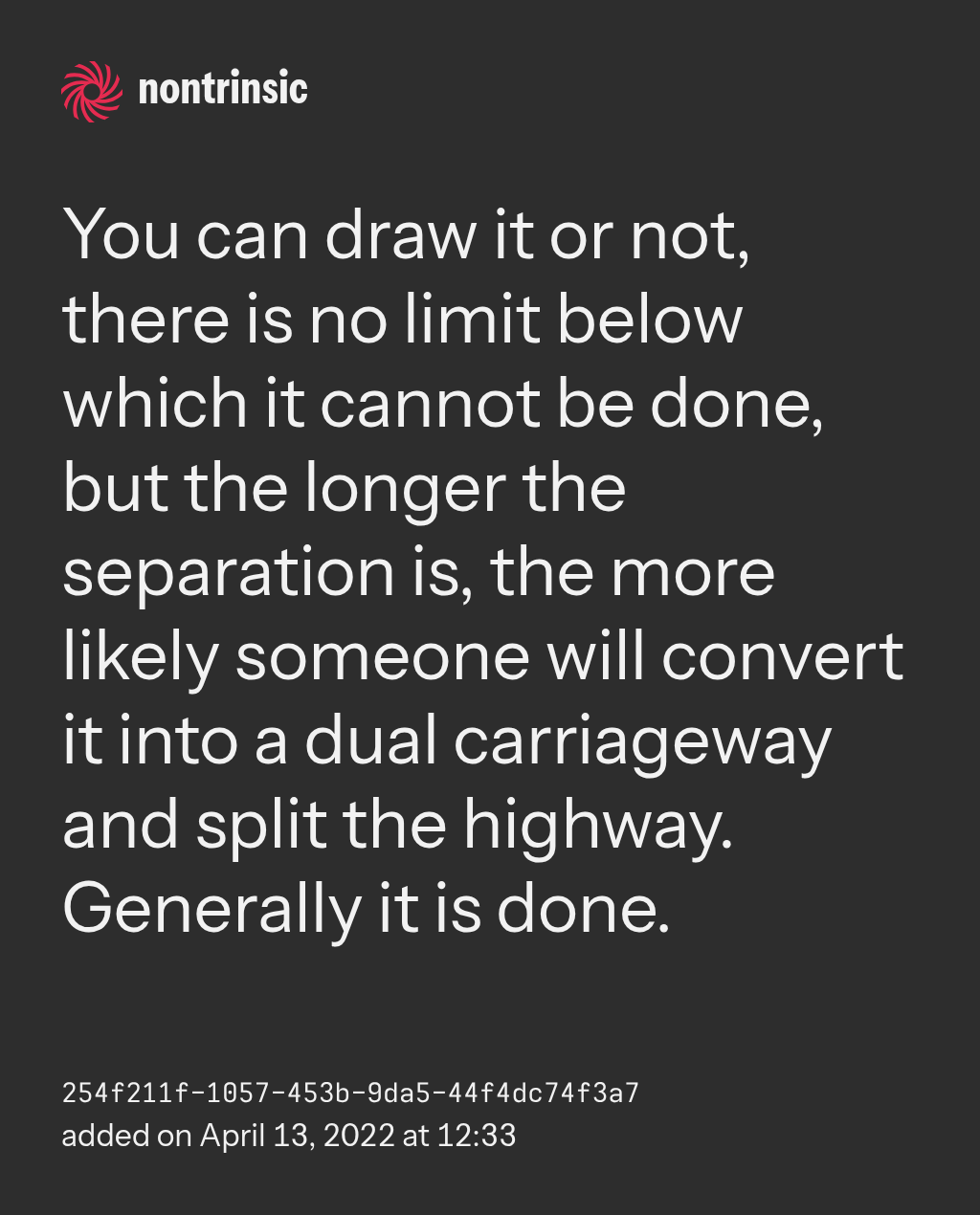 partagerYou can draw it or not, there is no limit below which it cannot be done, but the longer the separation is, the more likely someone will convert it into a dual carriageway and split the highway. Generally it is done.