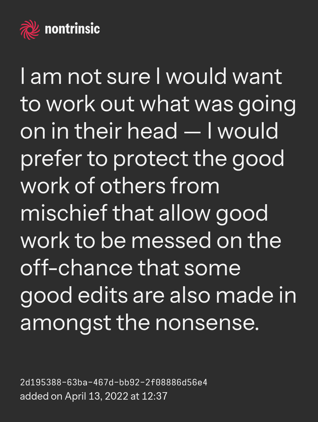 partagerI am not sure I would want to work out what was going on in their head — I would prefer to protect the good work of others from mischief that allow good work to be messed on the off-chance that some good edits are also made in amongst the nonsense.