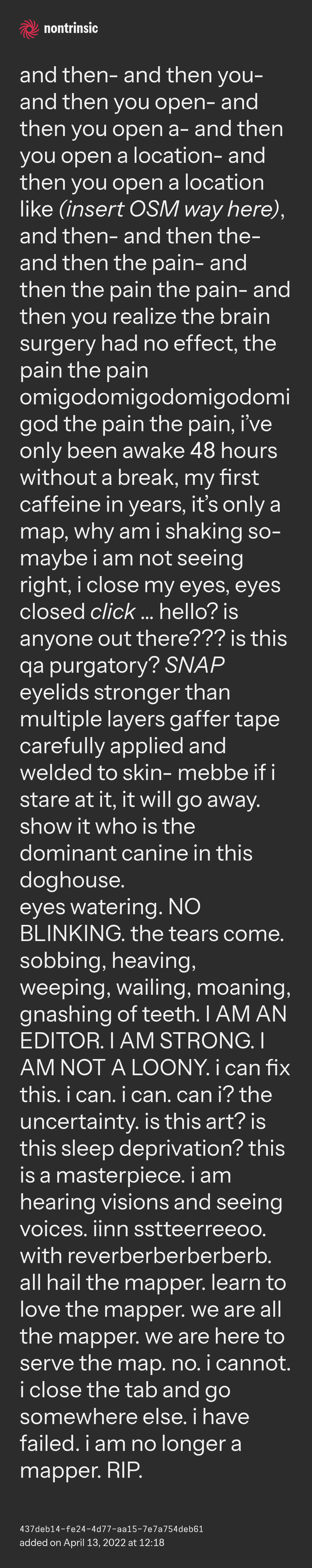 partagerand then- and then you- and then you open- and then you open a- and then you open a location- and then you open a location like (insert OSM way here), and then- and then the- and then the pain- and then the pain the pain- and then you realize the brain surgery had no effect, the pain the pain omigodomigodomigodomigod the pain the pain, i’ve only been awake 48 hours without a break, my first caffeine in years, it’s only a map, why am i shaking so- maybe i am not seeing right, i close my eyes, eyes closed click … hello? is anyone out there??? is this qa purgatory? SNAP eyelids stronger than multiple layers gaffer tape carefully applied and welded to skin- mebbe if i stare at it, it will go away. show it who is the dominant canine in this doghouse.
