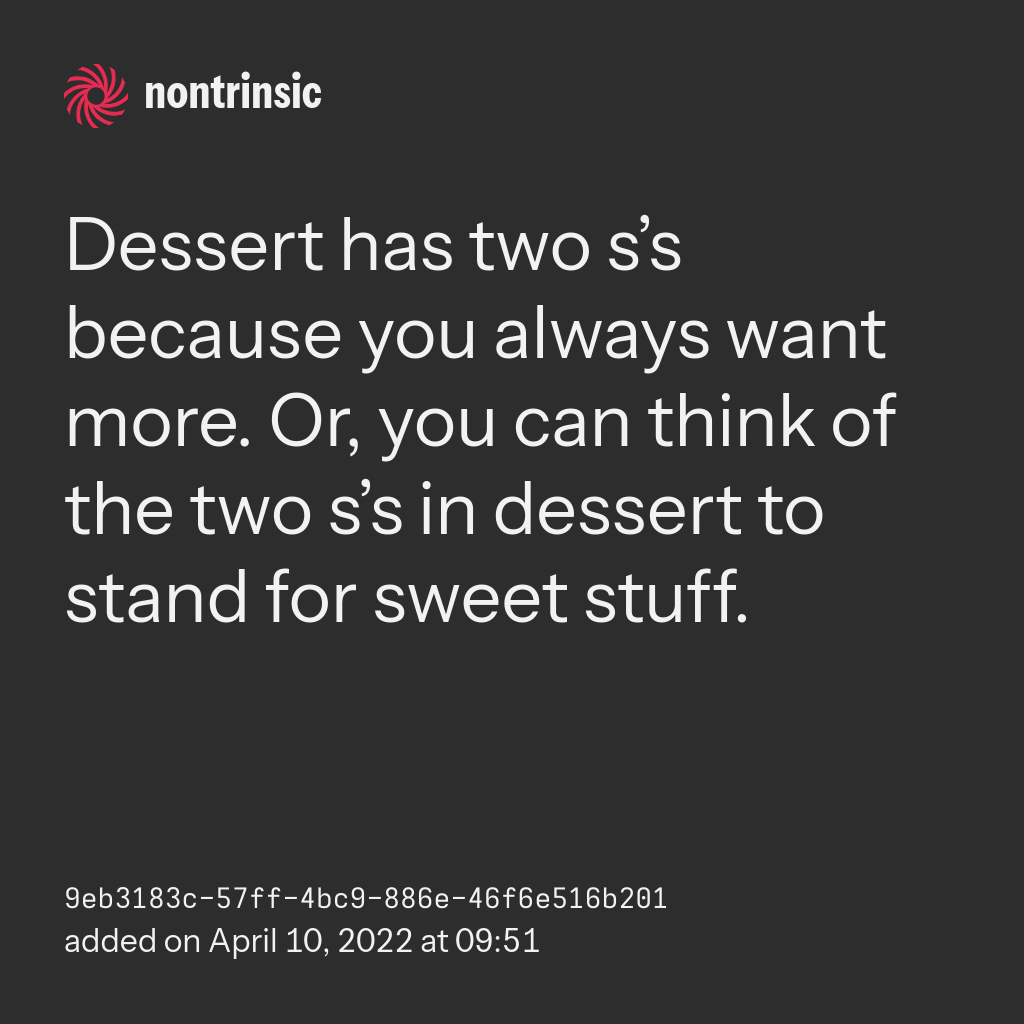 partagerDessert has two s’s because you always want more. Or, you can think of the two s’s in dessert to stand for sweet stuff.
