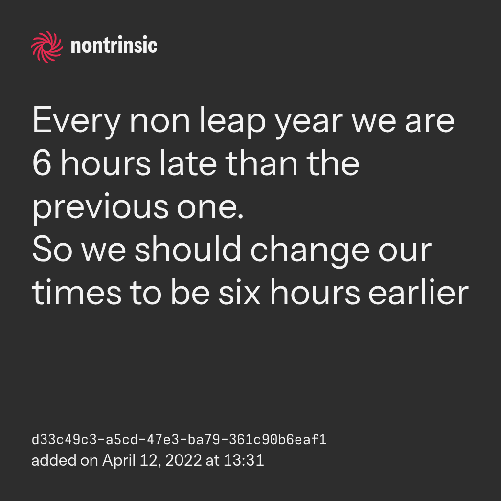 partagerEvery non leap year we are 6 hours late than the previous one.