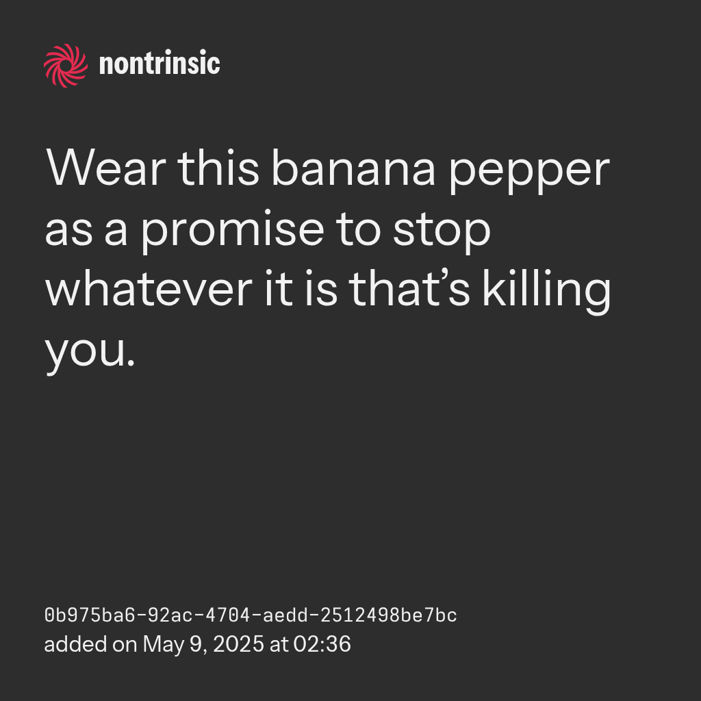 bagikanWear this banana pepper as a promise to stop whatever it is that’s killing you.