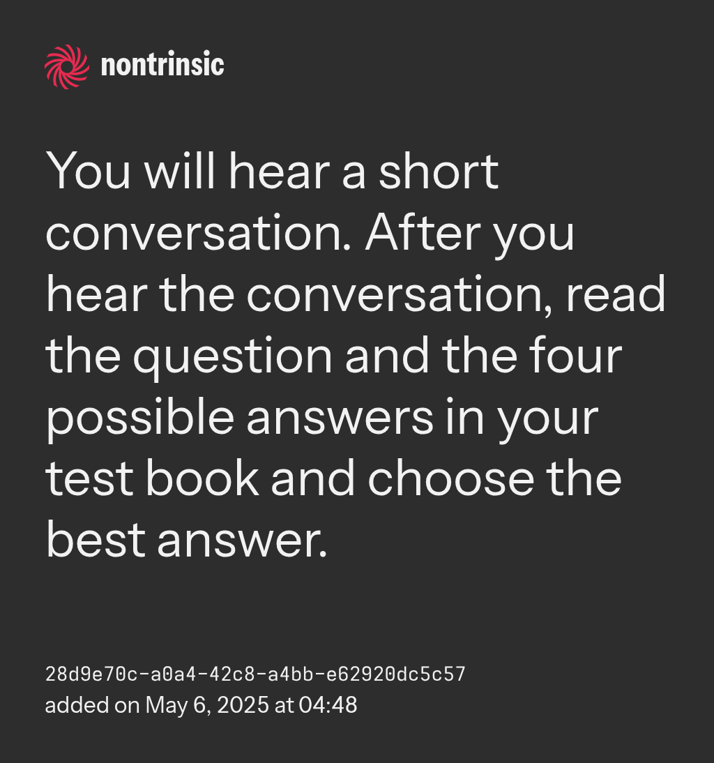 bagikanYou will hear a short conversation. After you hear the conversation, read the question and the four possible answers in your test book and choose the best answer.