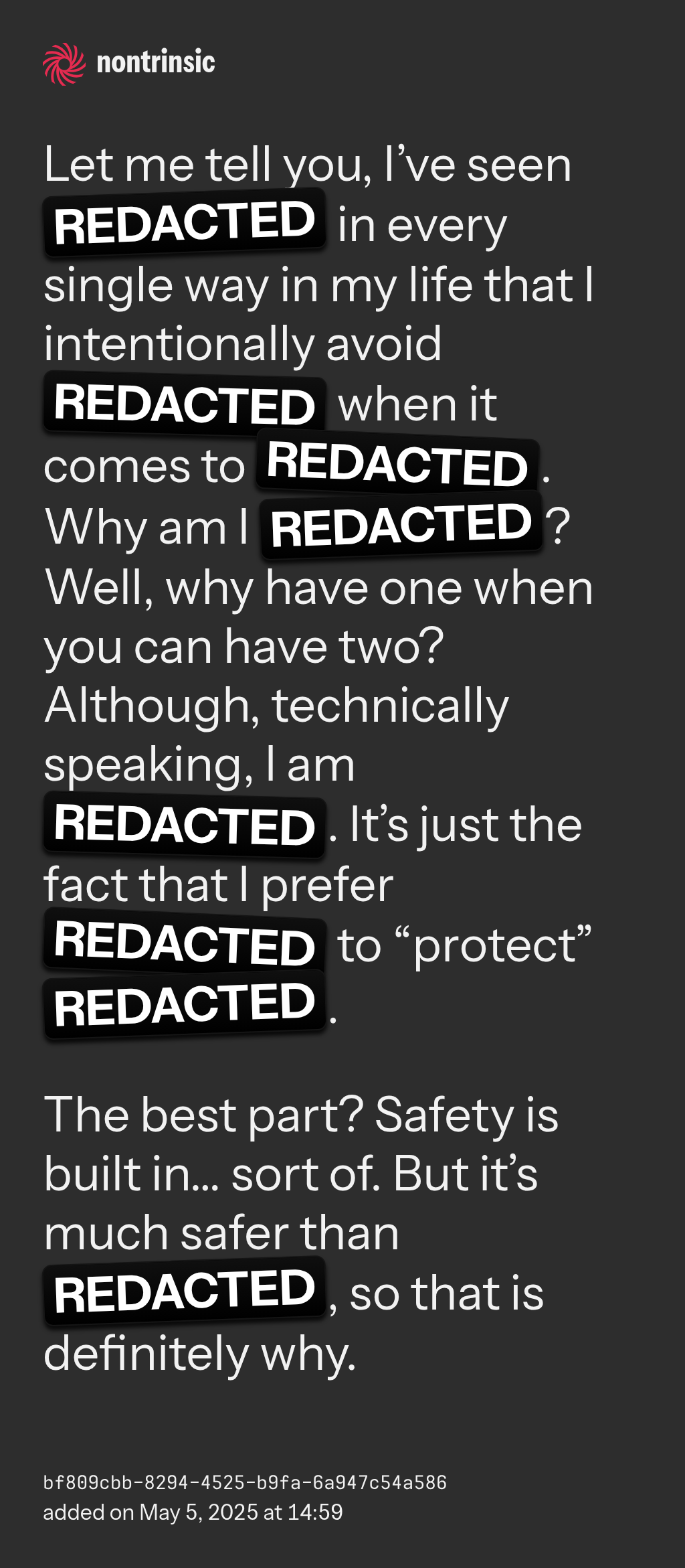 bagikanLet me tell you, I’ve seen REDACTED in every single way in my life that I intentionally avoid REDACTED when it comes to REDACTED. Why am I REDACTED? Well, why have one when you can have two? Although, technically speaking, I am REDACTED. It’s just the fact that I prefer REDACTED to “protect” REDACTED.